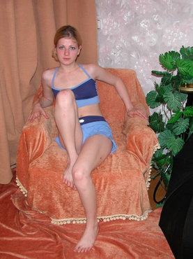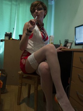 Оставшись в темной комнате с кожаным диваном коричневого цвета, милашка посчитала что было бы неплохо оголиться. Нимфа осталась лишь в белых чулках с узором в виде красных сердец и прозрачной тунике. Бестия не стеснялась облокачиваться на диван, выпячивая попку назад, или раздвигать длинные ножки, показывая половые губы.
