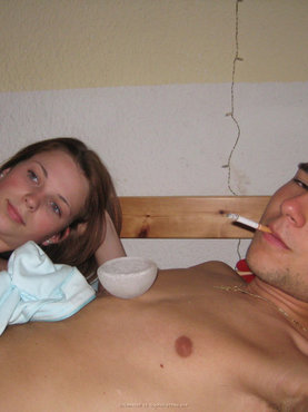 Симпатичная девка с неплохими буферами сняла с себя абсолютно все и легла на кровать рядом со своим избранником. Просто лежать в обнимку с законным мужем раскрепощенная молодуха не хотела, поэтому попросила его фоткать то, как она показывает свою сексуальность прикрывая при этом все интимные места руками.