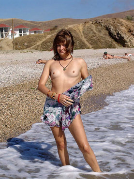 Зрелая красотка, приехав на отдых к берегу моря, захотела немного развлечься. В поисках острых ощущений милая развратница с огромными сиськами, раздевается прямо у машины, но, увидев золотой пляж, грешница хочет порезвиться и на нем. Добравшись к морю, озорная нимфа охотно гуляет голышом на фоне голубых волн.