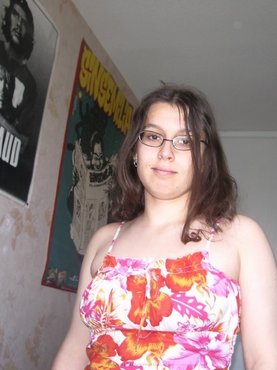 Зайдя на кухню в бледно-оранжевом сарафане, молодая девушка завелась и мигом сняла с себя наряд, обнажив тем самым не только свои большие буфера, но и волосатый лобок. После этого сексуальная удовлетворительница надела сетчатые чулки черного цвета и забравшись на стол начала показывать огромные титьки, не пряча небритую киску.