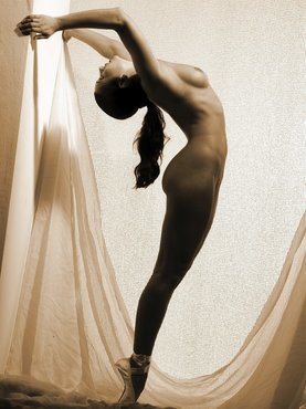 Перед ответственным выступлением блондинка с отличной фигурой пришла на репетиции и так как кроме нее в зале никого не было, она оставила на себе только балетки и начала голышом разминать свое тело. Грудастая балерина с сочными сосками уже не первый раз занимается без одежды, поэтому ее совершенно не смущает вид собственных голых прелестей.