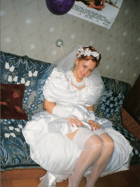 Сисястая девушка сразу после свадебной церемонии в одиночестве отправилась в отель и там начала грешить в одном из номеров наедине с собой. Не снимая с себя белоснежное свадебное платье, пошлая невеста раздвигает ножки и показывает волосатую письку отодвигая от нее трусы, а так же не стесняется иногда трогать рукой зону бикини и массировать клитор.