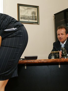 Гламурная блондинка в чулочках зашла в кабинет шефа и начала дразнить его, задирая и без того короткую юбку. Мужик долго не продержался и начал жадно сосать и лизать ее стройные ножки в нейлоне, а потом зарылся лицом между ног секретарши, вылизывая ее пилотку. Затем красотка довела начальника до оргазма фут-джобом.